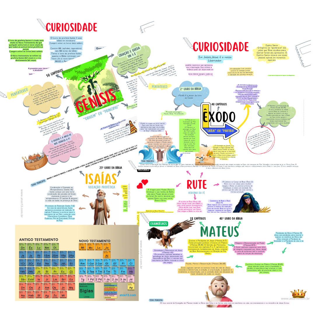 Nosso Mapa Mental da Bíblia reúne todos os livros do Antigo e do Novo Testamento, organizados de forma visual e criativa, para que você: